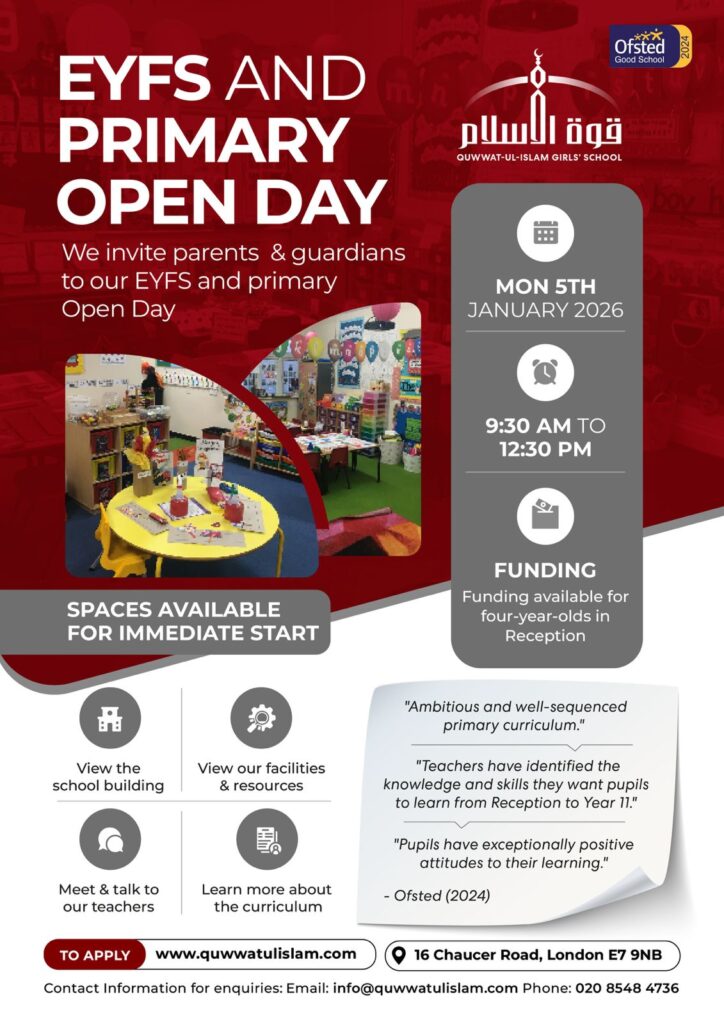 Join us for the EYFS & Primary Open Day at Quwwat‑ul‑Islam Girls’ School — Mon 5 Jan 2026, 9:30–12:30.